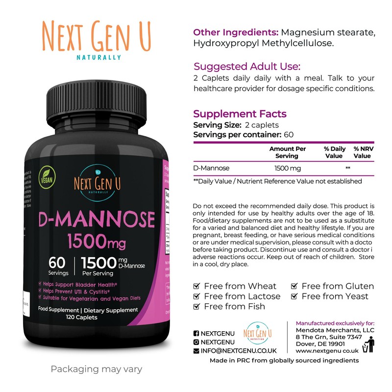 Ingredients: D-Mannose, Magnesium Stearate, HPMC (Vegetable Shell)