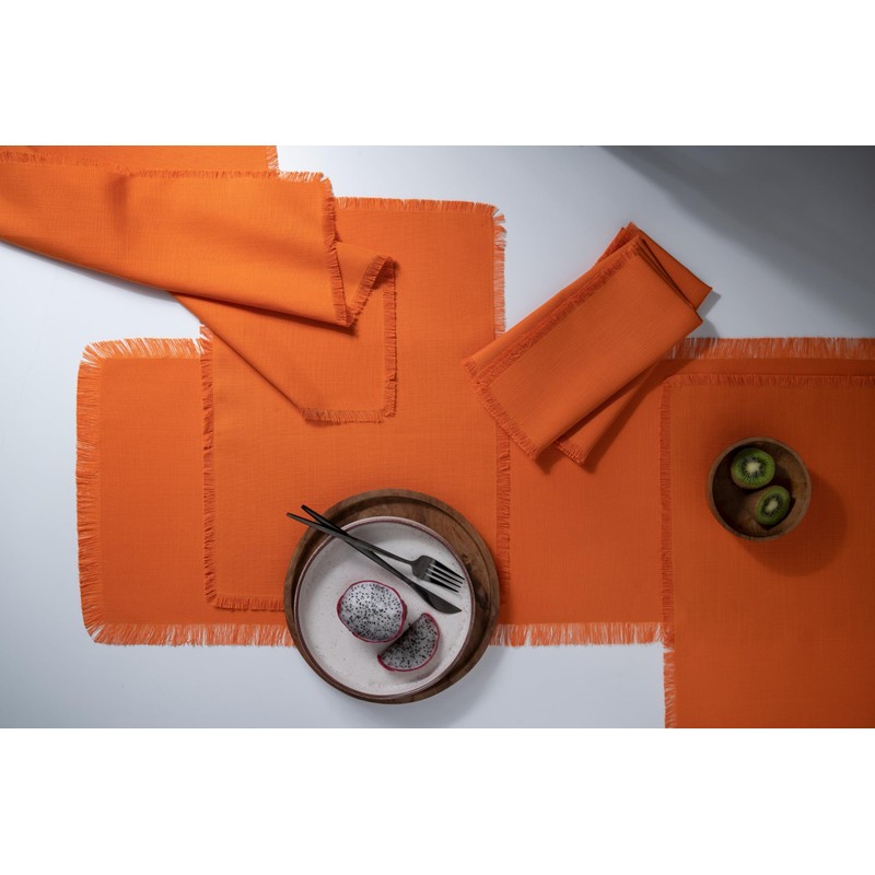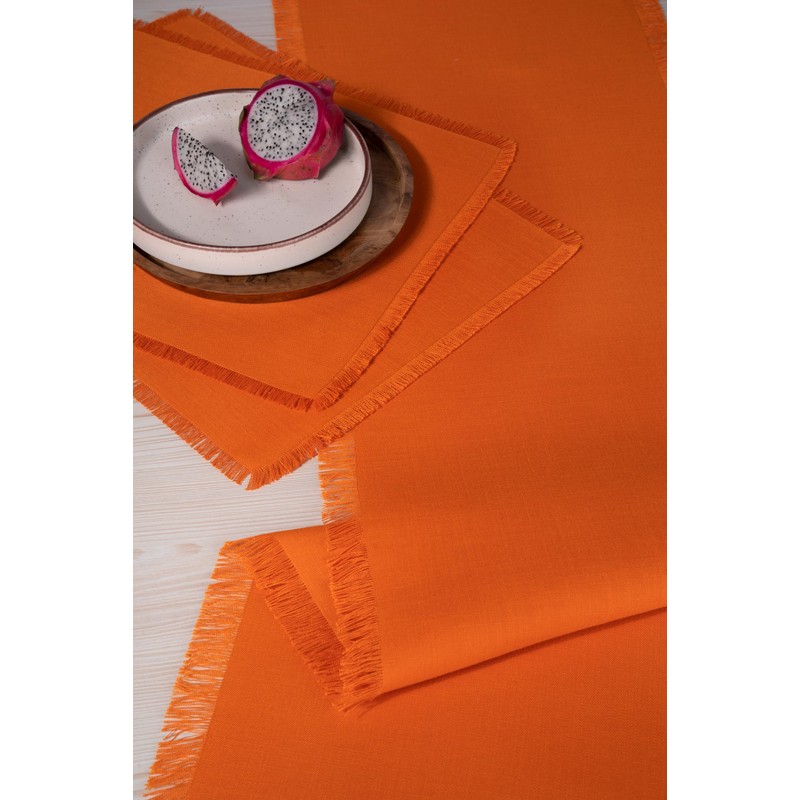 • PRODUCT - Orange Table Runner, Fringe, 14 x 36 Inch, 1 Inch Fringe; Faux Linen; handcrafted by specially trained artisans in small batches.