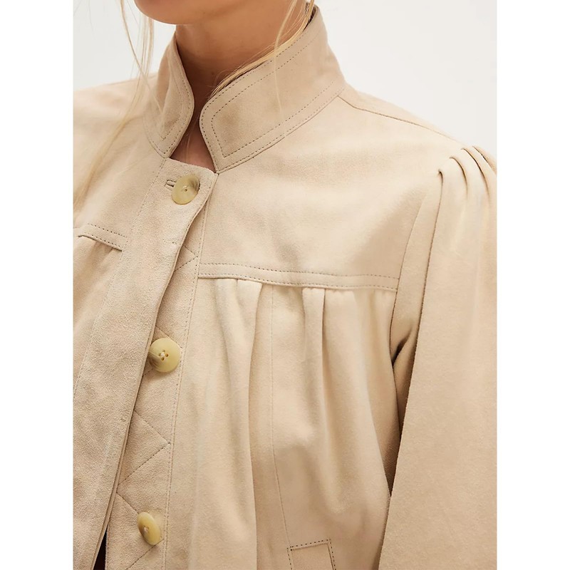 D Pastizales Women's Suede Cropped Pilot Jacket Puffed Sleeve Stand Up Collar Spring Autumn Button Coat Retro Moto Style(Tofu,S)