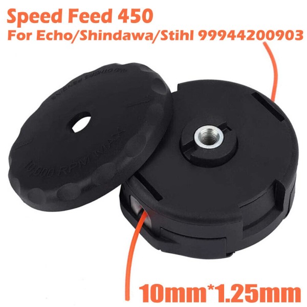Our Speedfeed 450 trimmer head replacement is built for heavy-duty cutting and trimming. Diameter: 4-1/2 inch; 10mm x 1.25mm LH thread. Holds 20' of .095"" trimmer line, accepts maximum line diameter .130"".