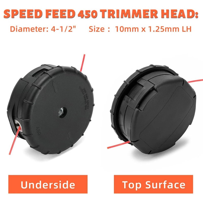 Our Speedfeed 450 trimmer head replacement is built for heavy-duty cutting and trimming. Diameter: 4-1/2 inch; 10mm x 1.25mm LH thread. Holds 20' of .095"" trimmer line, accepts maximum line diameter .130"".