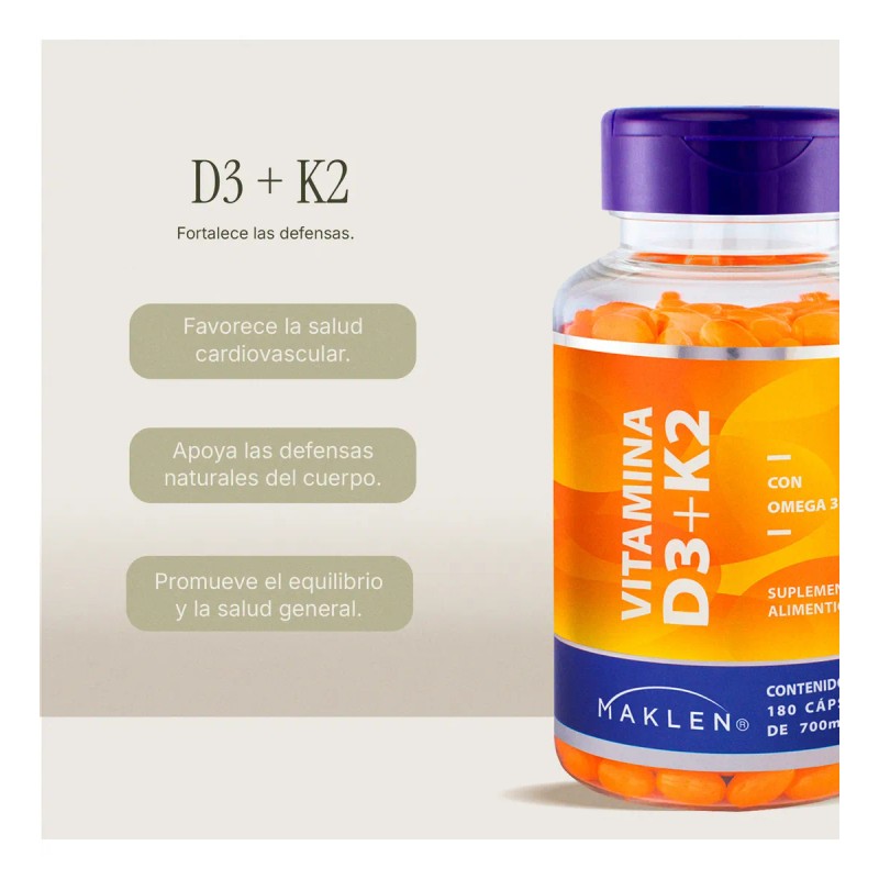 D3 + K2 | Vitamina D3 + K2 + Omega 3 | 180 Cápsulas | Maklen Sabor Sin sabor