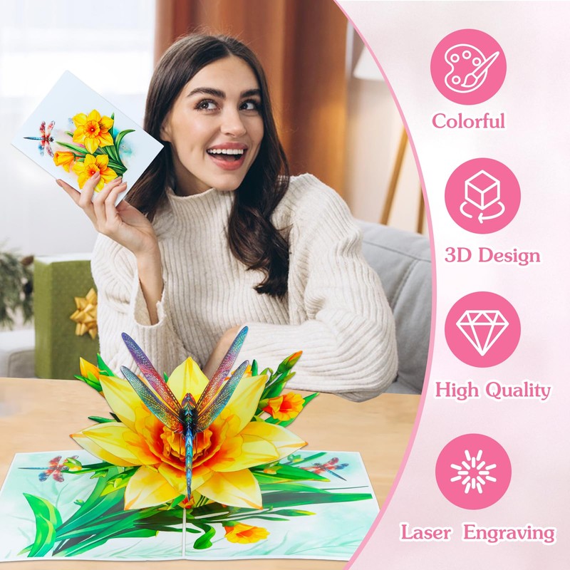 - 【Quality Material】 The dragonfly pop up card is made of high quality cardstock that's thick and durable, clearly printing, Daffodils flower gifts pop up card blend creativity, exquisite craftsmanship, and beautiful emotions. These captivating pieces of art are sure to leave a lasting impression