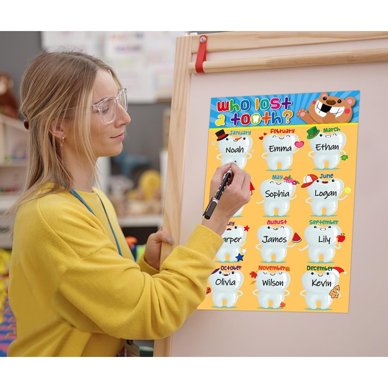 - 【Who Lost a Tooth Chart Poster】: Who lost a tooth chart poster promotes students' oral health awareness. With its "Who lost a tooth?" headline and cartoon teeth displaying with 12 months,kids can have fun while tracking their classmates' tooth loss experience.