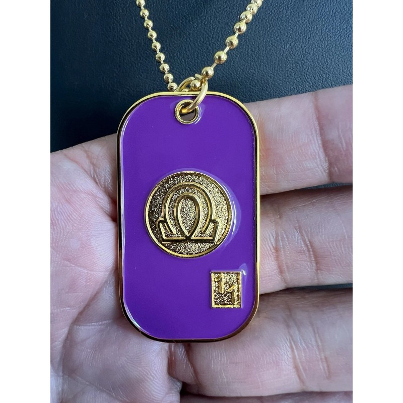 Indulge in the exquisitely crafted purple enameled dog tag necklace adorned with the iconic Omega Psi Phi Symbol and the founding year "11" embossed on one side, and the inspirational F.I.E.T.T.S. on the other, elegantly written in gold.