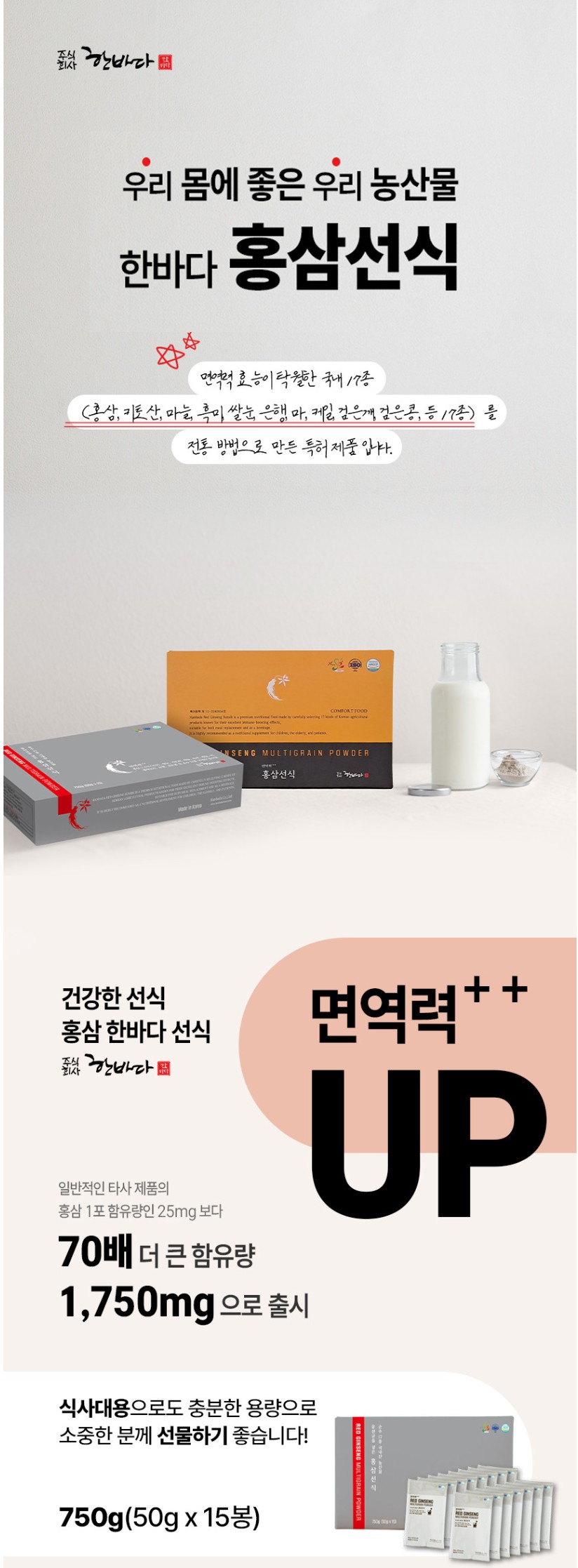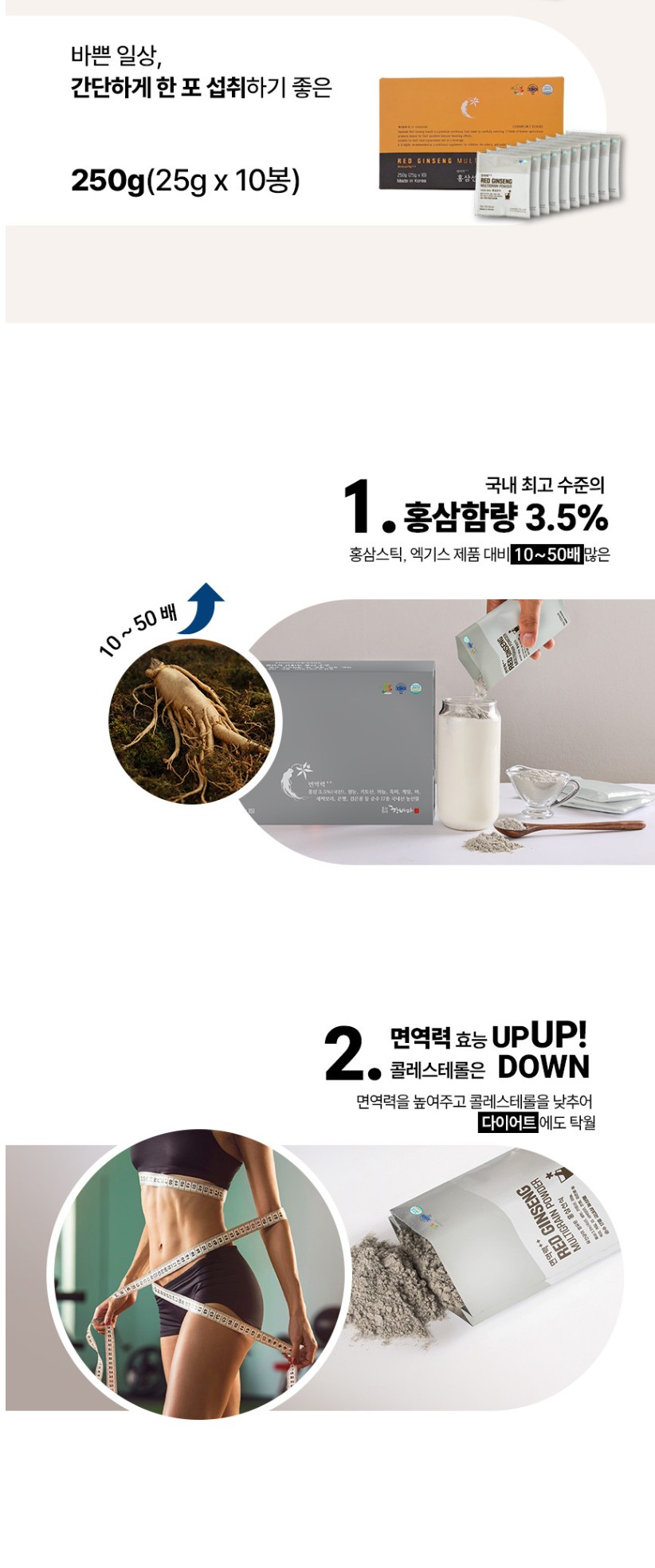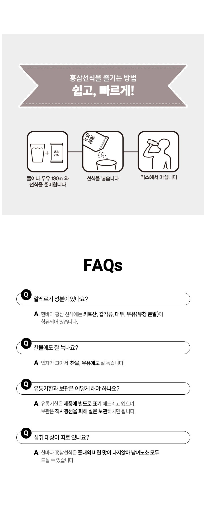 - Feature: Red Ginseng 3.5% (Korean), Alpha Rice Flour (Korean), Black Rice (Korean), Lactic Acid Bacteria (Korean), Black Sesame (Korean), Black Beans (Korean), Chitosan (Korean), Rice Germ (Korean), Barley Sprout (Korean), Yam (Korean), Shiitake Mushroom (Korean), Carrot (Korean), Sweet Potato (Korean), Kale (Korean), Garlic (Korean), Ginkgo (Korean), Brown Rice (Korean), Glutinous Rice (Korean), Soybean (Korean), Malt (Korean), Barley (Korean), Glucose, Refined Salt, Vegetable Cream [Corn Syrup, Palm Oil (Malaysian)], Whey Powder (Foreign: 0 countries, France, Czech, etc.), Alpha Starch (Foreign: Russia, Hungary, Serbia, etc.), Soybean, Milk (Whey Powder)