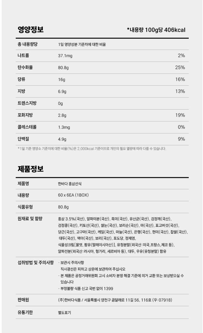 - Feature: (주)Hanbada Food / 56, Gomdallae-ro 11-gil, Yangcheon-gu, Seoul, 116 (Zip: 07918)