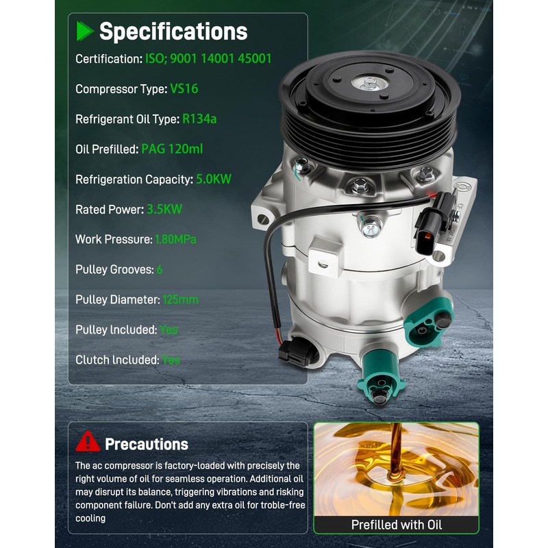 • Specifications: ①Compressor Type: VS16; ②Pulley Grooves Quantity: 6; ③Pulley Diameter: 125mm; ④Clutch Included: Yes; ⑤Oil Prefilled: PAG 120ml; ⑥Refrigerant Oil Type: R134a
