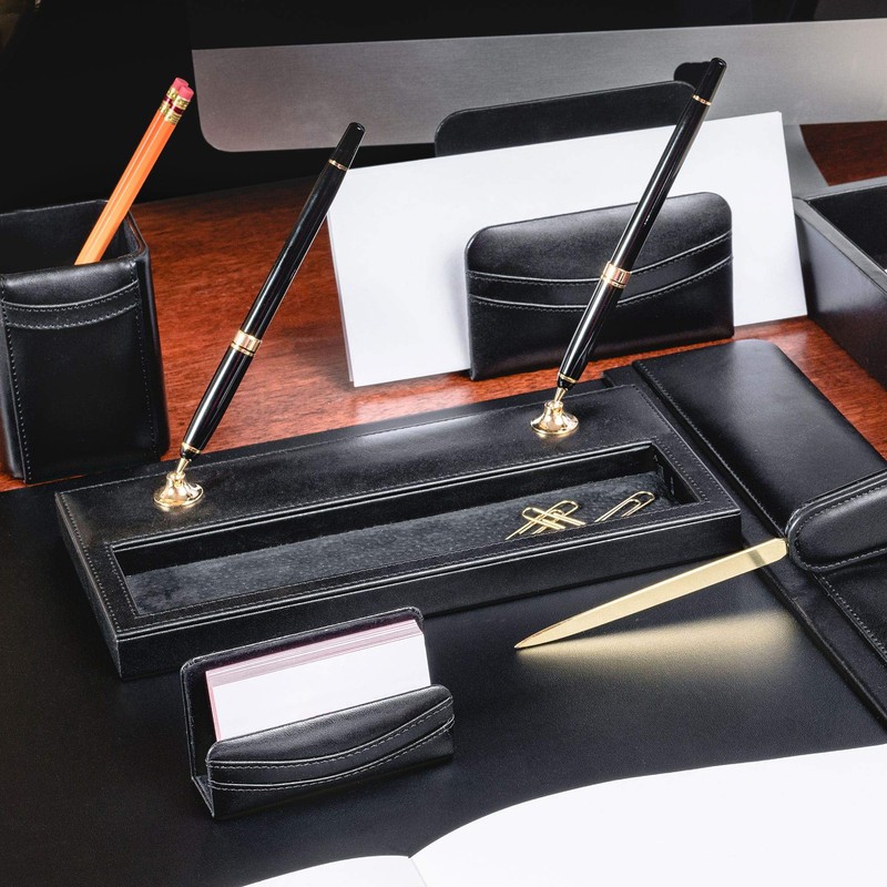 The black leather double pen stand is handcrafted with top-grain leather. Underneath is finished with a felt material to protect any surface. This pen stand includes two black ink rolling ball pens with gold accents and is a great addition to your workspace.