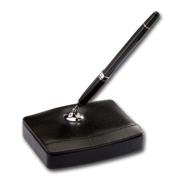 A great addition to any desktop or workspace, this single pen stand will add class and sophistication to your office or conference room! Built with a top-grain leather and felt backing, this piece is designed to last for years and keep your desk or boardroom table surface safe from scratches. The pen stand includes a black ink rolling ball pen. This pen stand is great for your desktop, or perfect to use for each attendee in your conference room. Dress up your office today and keep pens close at hand with this stylish piece!