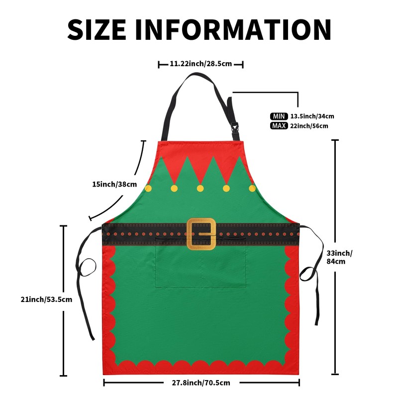 - Standard Size: The christmas Elf bibs apron measure is 33 x 28 inches(84 X 70cm), Unisex, suitable for men and women with adjustable neck straps and long ties.
