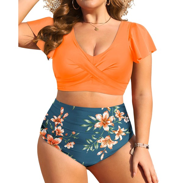 - Plus Size Orange Flowers Bikini Set: Featuring a twist-front bikini top with vintage ruffle sleeves for a chic, retro vibe. The U-shaped back offers sun protection, ensuring you stay confident and stylish all summer. Embrace your curves with our elegant plus size bikini.