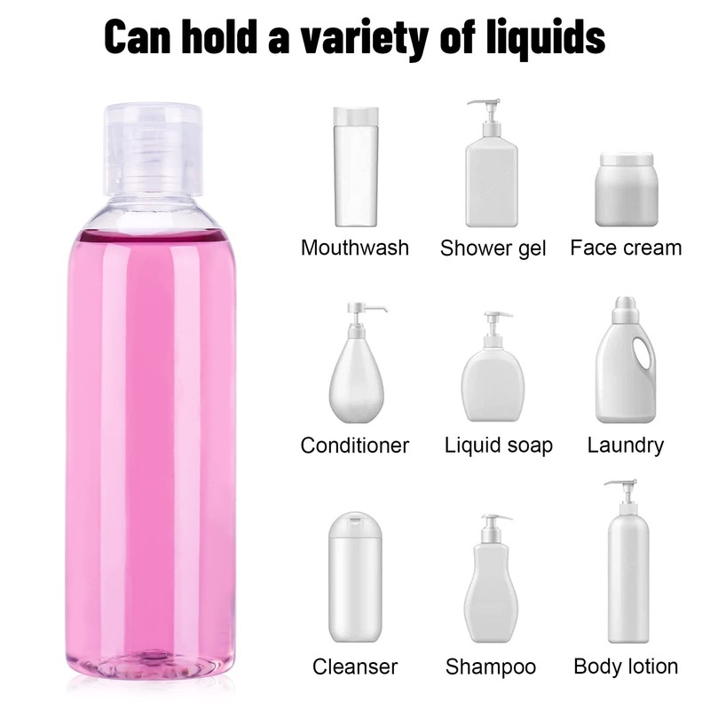 Multi-purpose- These clear travel bottles 100ml can work to fit shampoo, conditioner, body lotion, hand cream, shower gel, sun cream and other cosmetics.