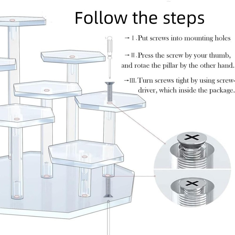 - 【Package &Size】Our acrylic display riser is packed with box, each acrylic board has protective film, packing including: 3.34” acrylic board x 7pcs, acrylic pillar x 7pcs, 8.26” large acrylic base x 1pc, screws x 14pcs, screwdriver x 1pc. Fully assembled