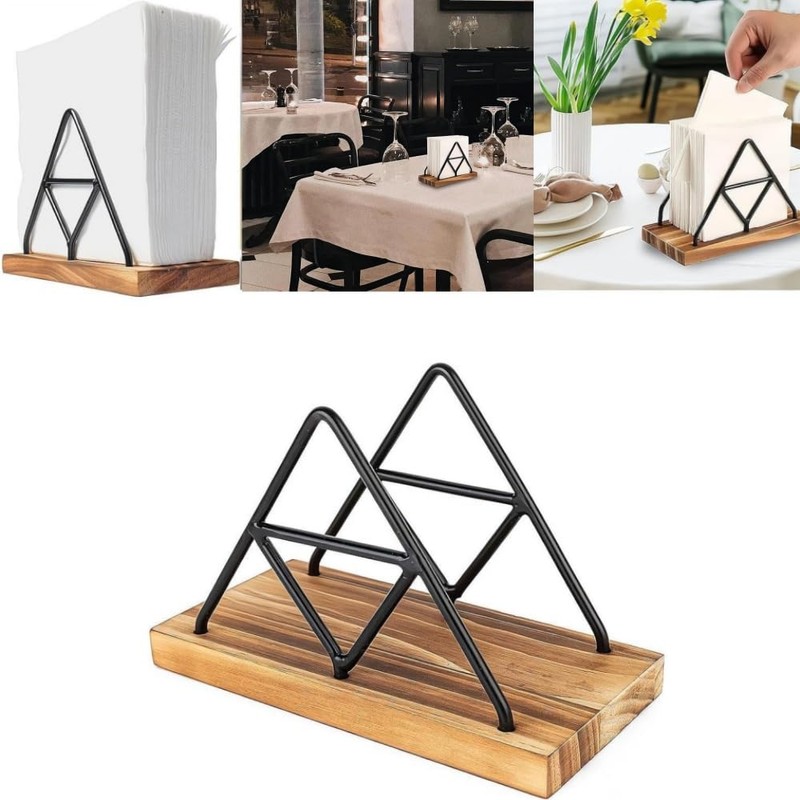 • 【Premium Material】:The bottom base of this napkin holder is made of high quality wood; the triangle black metal wire rack can keep napkins easily accessible on a tabletop surface; and 4 silicone non-slip pads can make the whole napkin holder more stable.