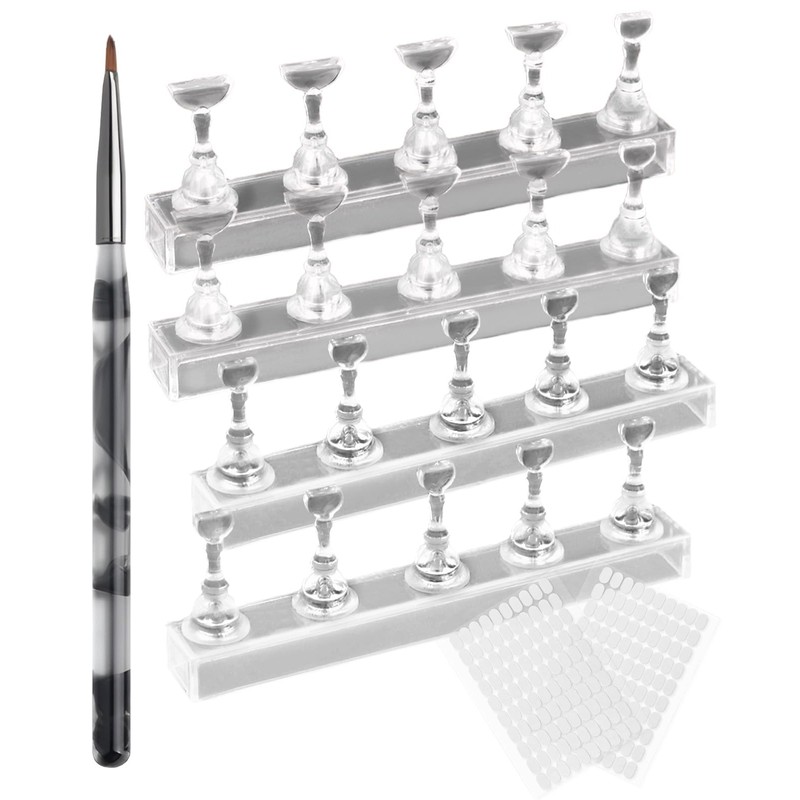 - Press On Nail Stand: Our nail stand set includes 4 sets of acrylic nail holders in 2 sizes, each with 1 transparent base and 5 chess shaped nail tip holders, plus 2 double sided adhesives and 1 nail pen for painting, making it ideal for creating flawless nail designs
