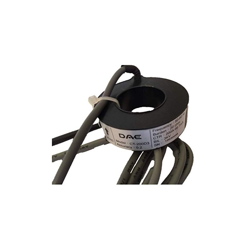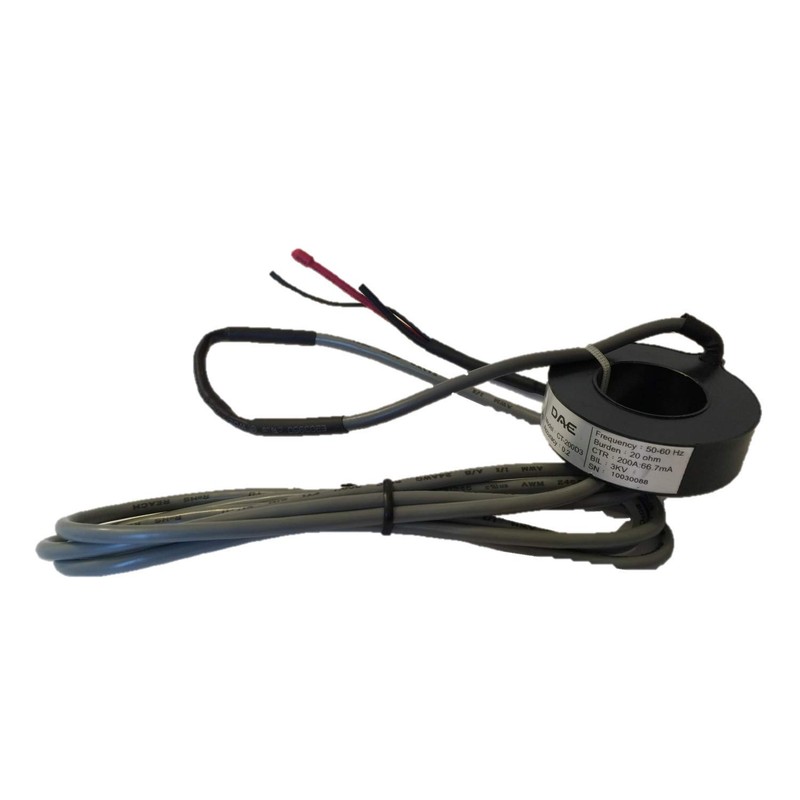 - 200A (200A:67mA) Solid Core CT (Current Transformer), inner diameter 1.02", outside dimension 2.13” x 2.13” x 0.71”, Weight: 3 oz, Lead wire: 38 inch, 20AWG; Accuracy: 0.3%; Frequency: 50–60Hz; Internal windings: 3,000. Compatible to all the DAE electric meters.