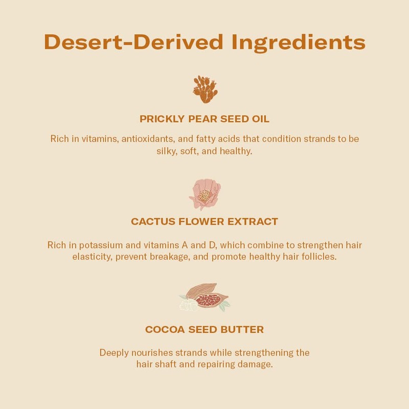 • KEY INGREDIENTS - Cactus Flower Extract: Strengthens hair elasticity, & prevents breakage. Cocoa Seed Butter: Nourishes strands, strengthens the hair shaft, & repairs damage. Prickly Pear Seed Oil: Conditions strands to be silky, soft, & healthy.