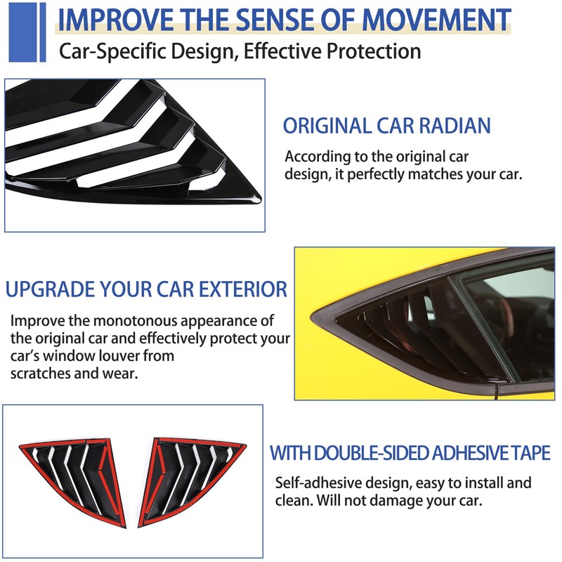 - 🚗【Easy Installation】— Rear side window louver shutter cover is easy to install and use, With adhesive tape on the back, Wipe clean your Rear Quarter Window around in advance, and press firmly to ensure a good grip of the adhesive.
