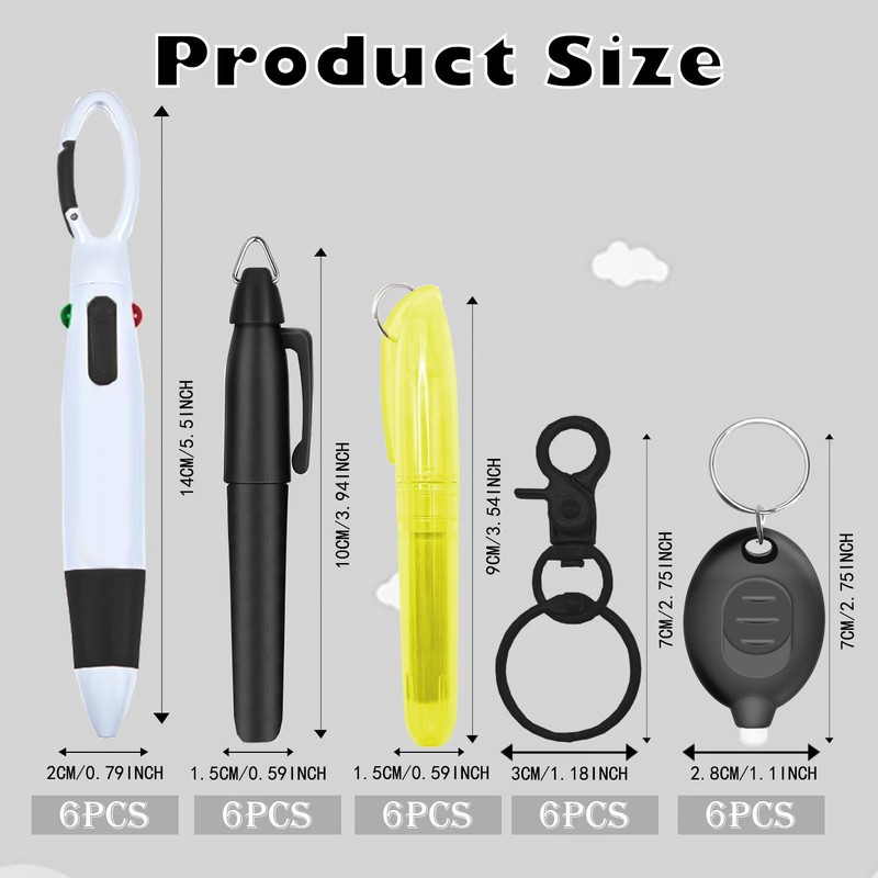 - Comprehensive Set: Our package includes highlighters, Multicolor ballpoint pen, zinc alloy keychains, LED flashlights, and permanent markereach with 1PCS for a total of 6 PCS. Whether you're jotting down notes or in need of emergency lighting during outdoor activities, this set has you covered.