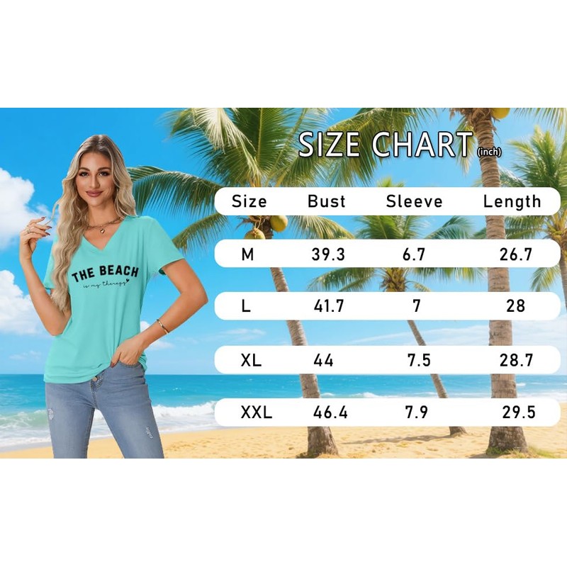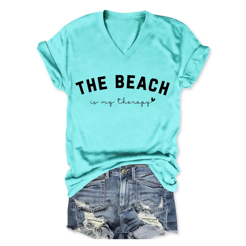 DAFOUOE The Beach is My Therapy Shirts for Women, Funny V Neck Short Sleeve Tops Loose Fit Casual Letter Print Graphic Tees Blue