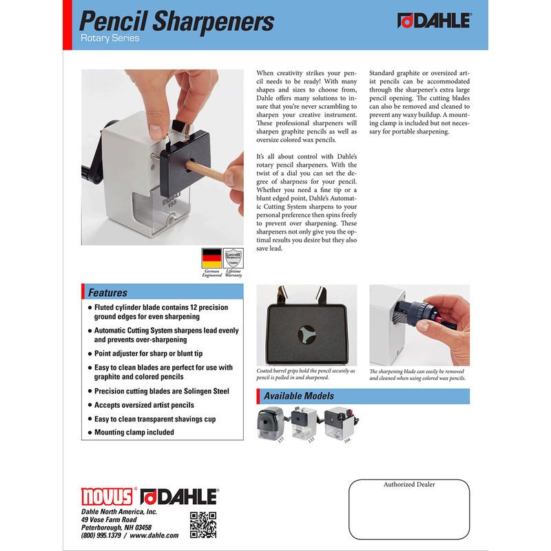 The Dahle 133 Personal Rotary Pencil Sharpener is designed to create smooth, precise points. It features an automatic cutting system that prevents over- sharpening, a point adjuster for a sharp or blunt tip, and a steel cutting cylinder with 12 ground edges for even lead exposure. This German engineered sharpener is ideal for personal use and includes an optional table mount.