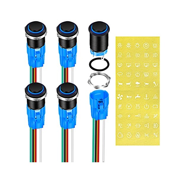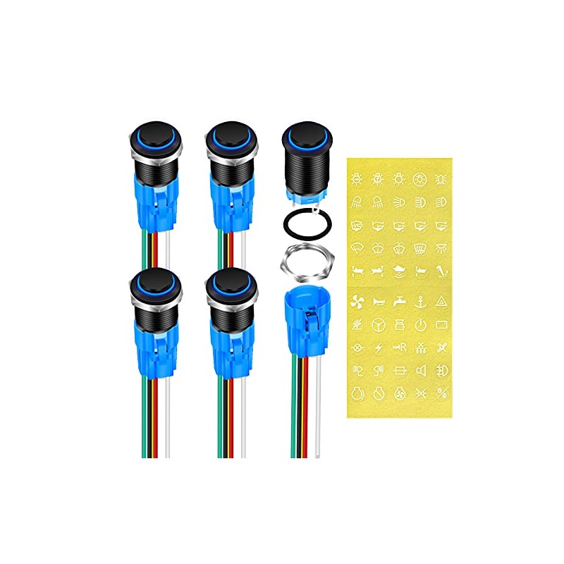 - LED Push Button Switch, 5A 12VDC rating, with wiring harness. 16mm Pre Wired Pushbutton Switch require 5/8 Inch Panel Mounting Hole.