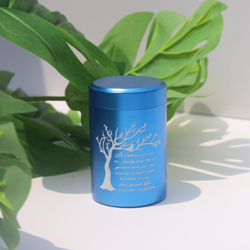 DAIFFUNE Small Urns for Ashes - Set of 4,2.7 inch Aluminium Mini Urns, Cremation Urns for Human/Pet Ashes, Ashes Holder, Small Keepsake urns-A Limb has Fallen from The Family Tree, Blue