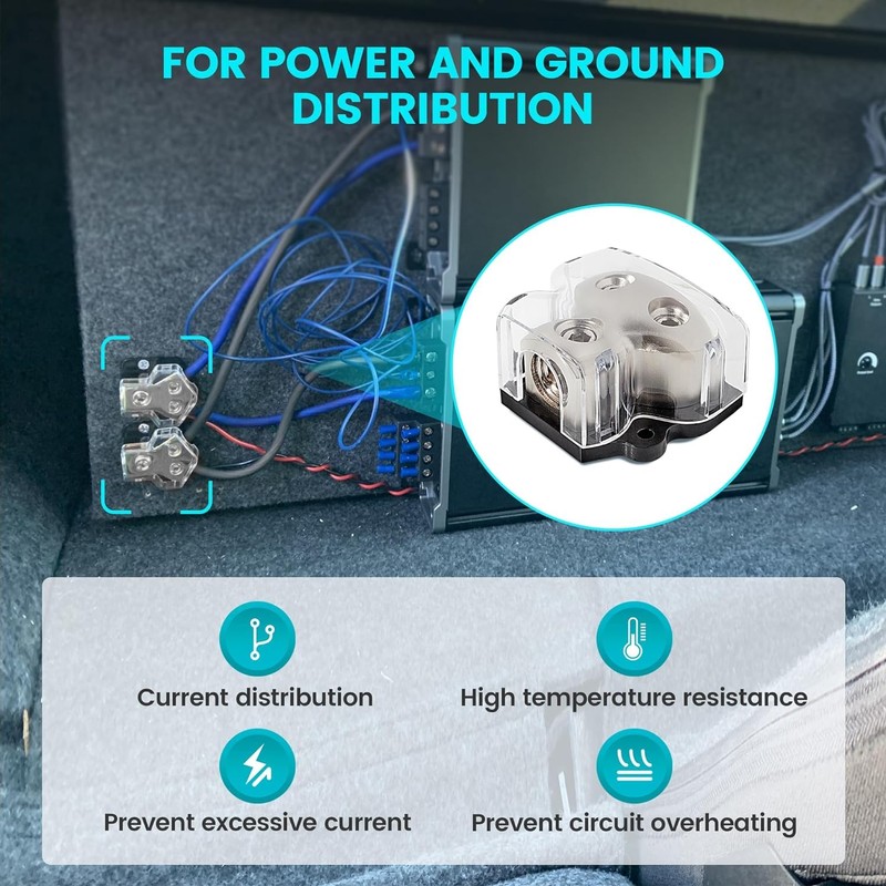 - High Quality: 2 way car audio power distribution block made of High-quality materials for good conductivity and superior resistance. High-temperature polycarbonate base and impact snap-in plastic cover provide insulation and protection.