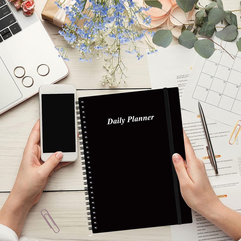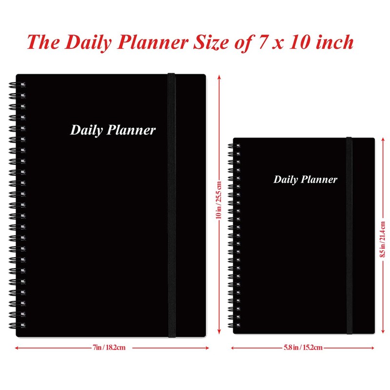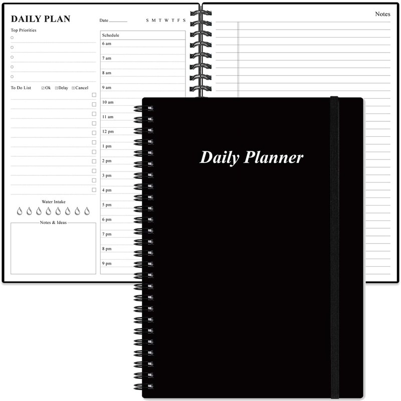 Daily Planner Undated - B5 To Do List Notebook Hourly Schedules, Spiral Appointment Planner for Women and Men, PVC Hardcover, Inner Pocket, Elastic Closure, 7" x 10", Black