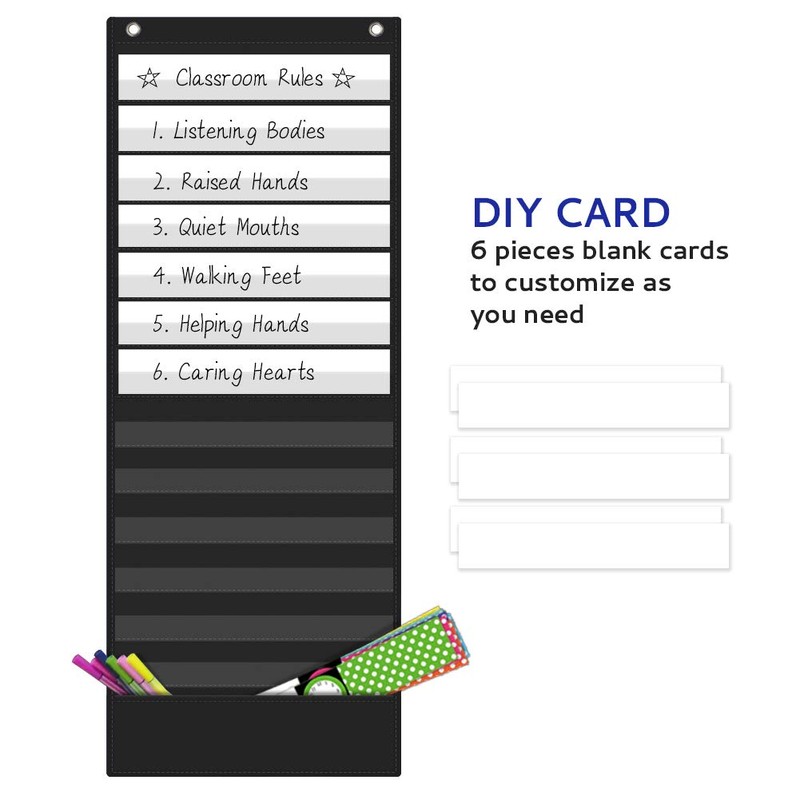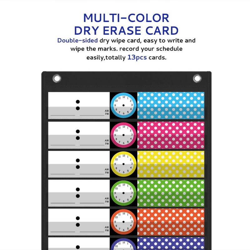 Pocket Chart for Classroom - Daily Schedule Black Hanging Foldable Pocket Chart with 13 Plastic Pockets – 1 Storage Pockets Key Product Features: We designed this pocket chart to be longer than most standard charts. It measures 35.3*12.8" W. There are 13 clear pockets + 1 storage pockets. Helping give more options to fit an entire classroom schedule. Included are 13 dry erase cards. 7 are pre-made with visually friendly colors. Along with 6 blank cards to customize as you please. This chart can be easy hanging. It fits nicely on doors, bulletin boards, or whiteboards. We are committed to providing high-quality products for classroom or home use. We stand behind our product with a 100% money back guarantee.