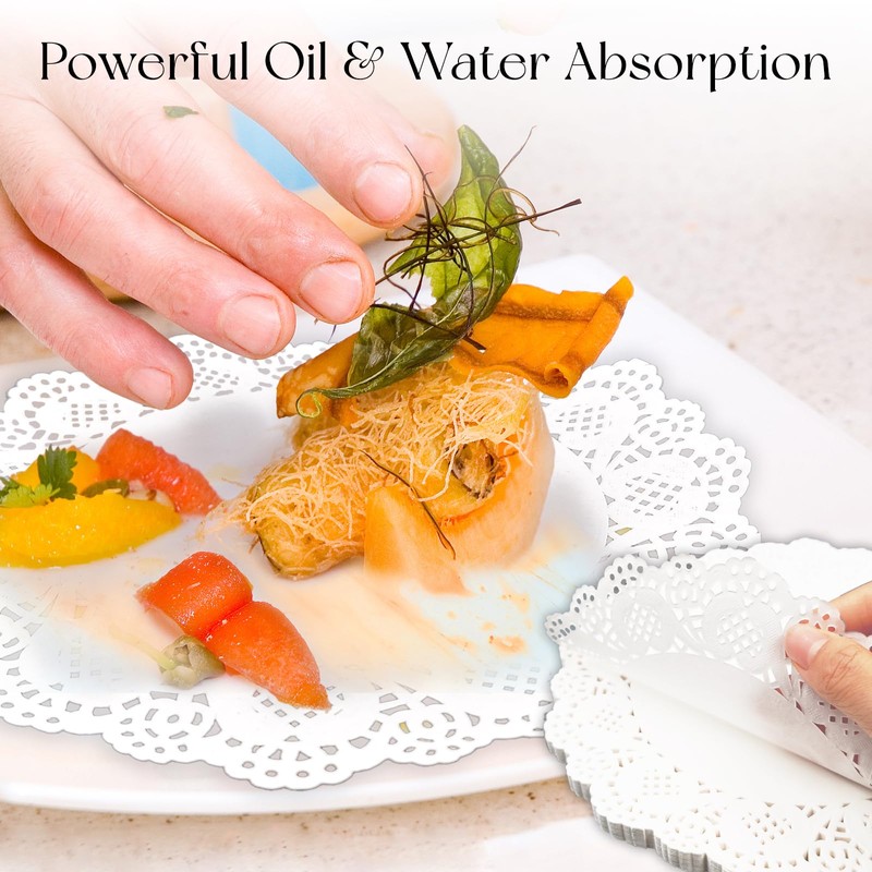 - 【Powerful Oil & Water Absorption-Saving Your Time】The paper placemats can prevent sticky or other hard-to-clean food from touching the plate directly,which can absorb oil and water well, and can also be used to filter grease.Place doilies for table lace on plates for fried food or cakes, you don't need to worry about cleaning after use,which is good to save your time.