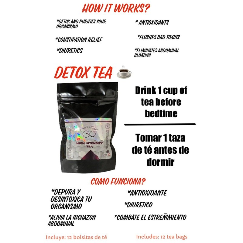Includes: 12 tea bags. Incluye: 12 bolsas de te 🚫Solo para adultos mayores de 18+. 🚫Only for adults 18+ 🚫No Recomendó a Mujeres embarazadas o Lactando 🚫Not recommended for Pregnant women or Breastfeeding 🚫Keep away from children 🚫Mantener lejos de niños 🟢WEIGHT LOSS DETOX BOOST , FOR FASTER RESULTS TAKE WITH DAILY DOÜS - DAILY WORK💊 📦FAST HANDLING TIME 1-2 business days 📫📦TO ALL USA 🇺🇸Shipped with USPS Ground advantage - ⭐️AUTHORIZED SELLER ⭐️