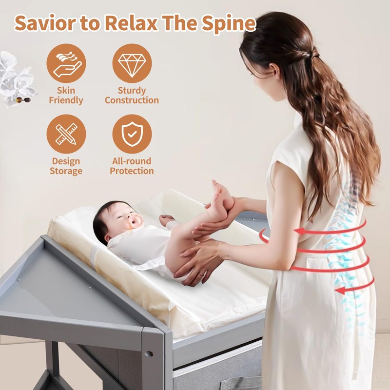 - Comfort-First Design: Experience comfort with the corner baby changing table, designed for no bending! Its sturdy construction and soft padding ensure a gentle experience for your baby, while the safety rail offers peace of mind