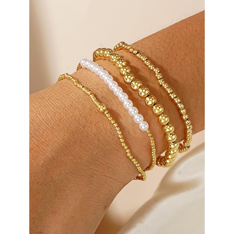 - Material:This set of gold-toned bracelets is a perfect blend of elegance and style. Featuring multiple strands with a mix of metallic beads and faux pearls, it adds a touch of sophistication to any outfit. Ideal for layering or wearing alone, it's a versatile accessory for everyday wear or special occasions.