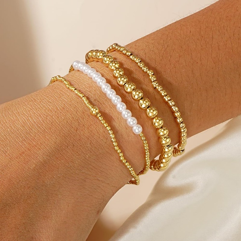Dainty 14K Gold Beaded Pearl Bracelet Stack for Women,4PCS Cute Bohemian Gold Plated Ball Beads Stackable Bracelet Set Fashion Prom Birthday Jewelry Gift Friendship