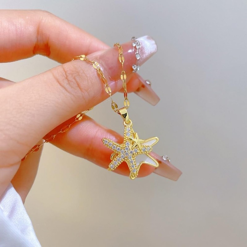 - ELEGANT DESIGN: Dainty starfish pendant necklace featuring sparkling CZ stones and shell charms, perfect for ocean-themed fashion accessories