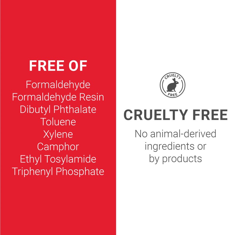 - Vegan, Cruelty Free, Non-Toxic 8-Free Formula - without formaldehyde, toluene, dibutyl phthalate, formaldehyde resin, camphor, ethyl tosylamide, xylene, triphenyl phosphate and animal derived ingredients.
