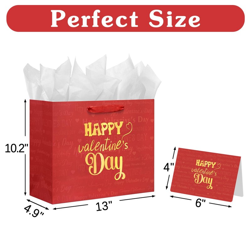 - Size: The valentines day gift bag measures 13" wide x 10.2" tall x 4.9" deep, providing ample space to hold large presents or an assortment of smaller items, making it ideal for any Valentine's celebration.