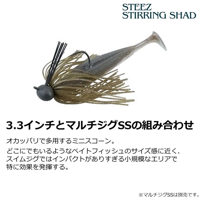 - 3.3" and Multi-Jig SS Combination: This mini scone can be used many times in the cockapuli. We especially recommend the combination of the multi-jig SS6g and the Sterling Shad 3.3". It is close to the size of a baitfish like you are in anywhere, especially effective in smaller areas where swim jigs are too impactful