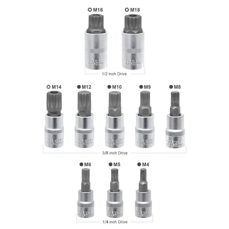 DAKCOS 10pcs Spline Socket Set,M-Type,M4-M18 for 1/2",3/8",1/4" Drive,Triple Square Spline Bit Set,Premium S2 Alloy Steel