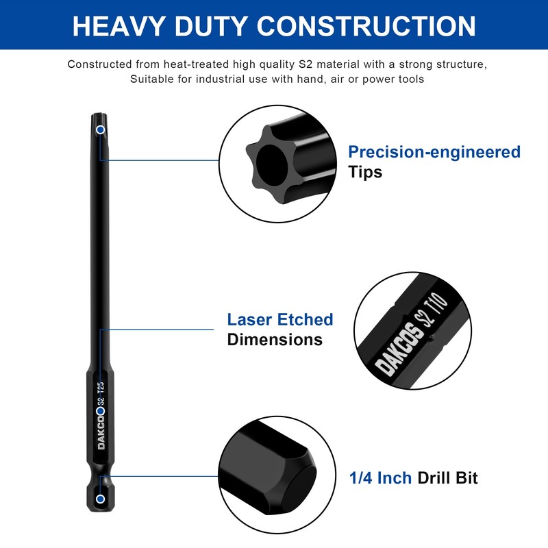 DAKCOS 11-Piece Tamper Proof Torx Bit Set, Premium S2 Alloy Steel Security Star Bits,100mm Long T6 - T40
