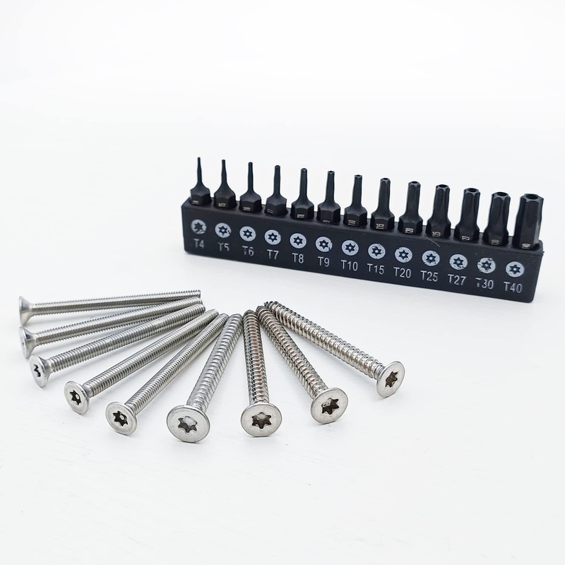 - 13 Pcs 1 inch Tamper Resistant star bits:T4/T5/T6/T7/T8/T9/T10/T15/T20/T25/T27/T30/T40 (T4 are not tamper proof security bits)