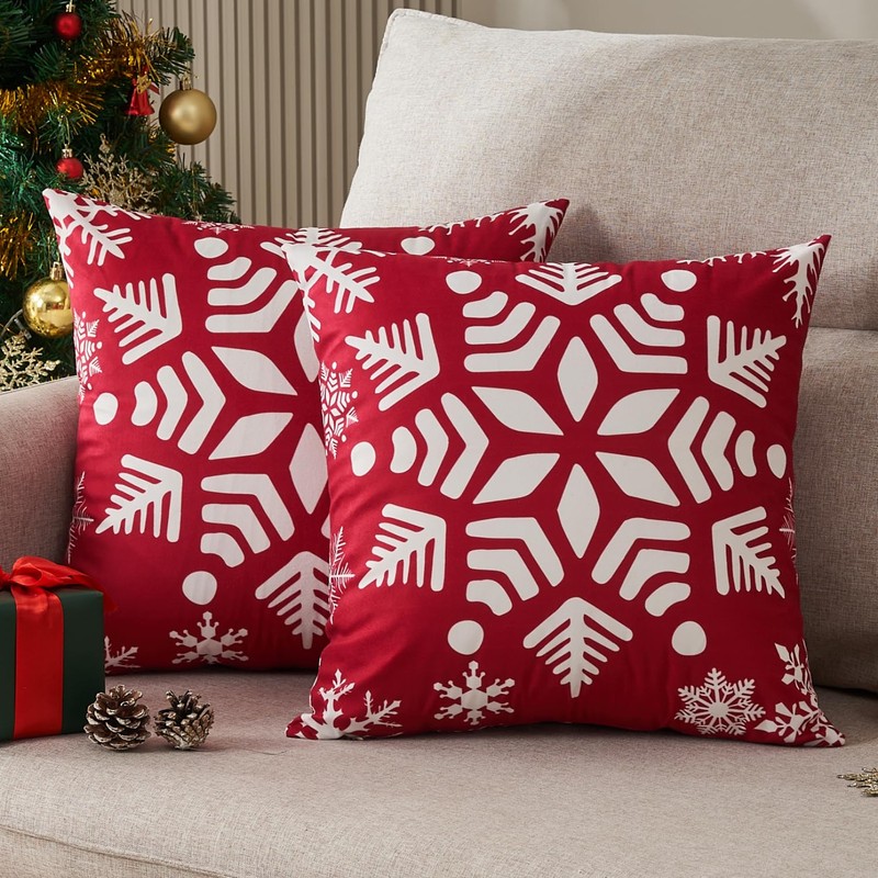DakTou Christmas Cushion Cover, 45 x 45 cm, Red Velvet Decorative Cushion Covers, Set of 2, Xmas Snowflakes Pattern, Sofa Cushion, Decorative Cushion Cover for Sofa, Bedroom, Living Room