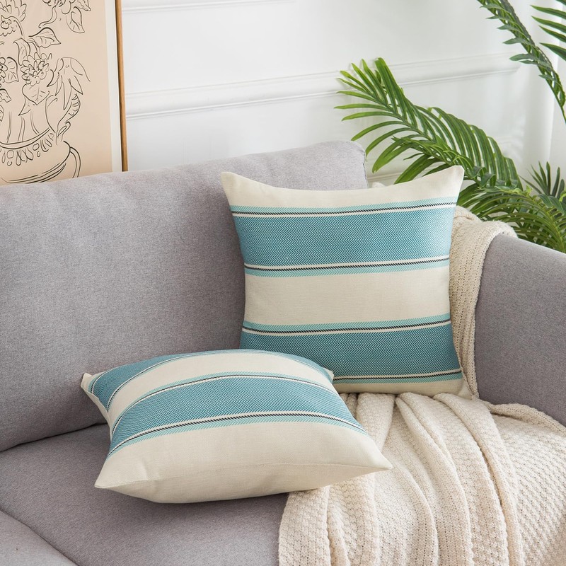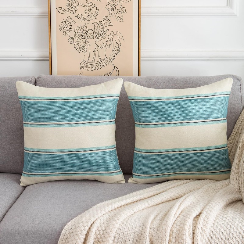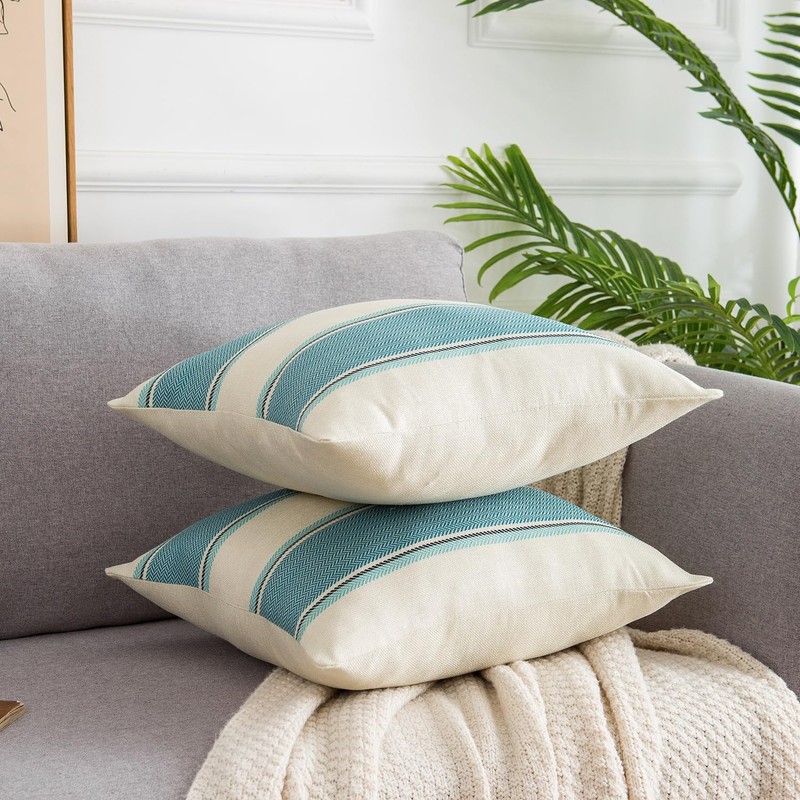 DakTou Cushion Cover Set of 2 40 x 40 cm Farmhouse Decorative Cushion Linen Sofa Cushion Stripes Cushion Covers Decorative Modern Turquoise Cushion for Sofa Chair Bedroom Office Car