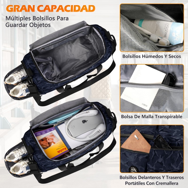• GRAN CAPACIDAD: Esta bolsa de viaje está configurada con múltiples compartimentos para organizar rápidamente sus pertenencias.1 bolsillo principal espacioso con 3 bolsillos interiores separados.1 bolsillo húmedo y seco, 1 bolsillo para zapatos, 1 bolsillo de malla transpirable, 1 bolsillo frontal portátil, 1 bolsillo trasero con cremallera, 1 bolsillo lateral. Se puede utilizar para poner zapatos, ropa de toalla, paraguas, ID, llaves, bolsa de aseo, equipo deportivo y así sucesivamente.