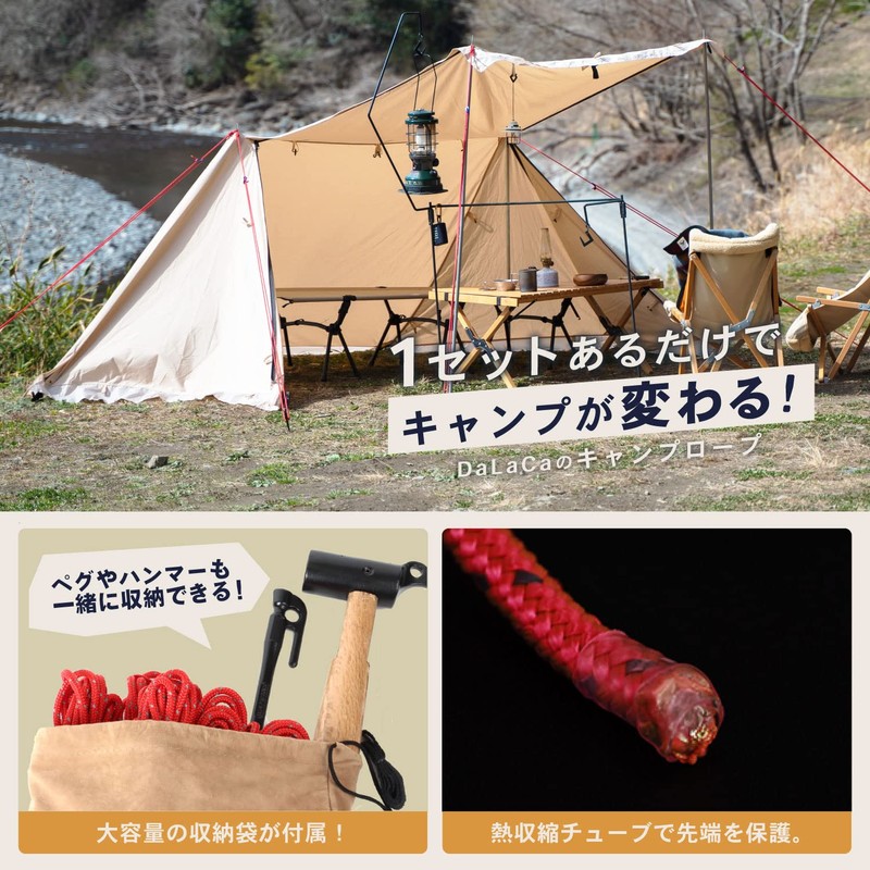 - Large-Capacity DaLaCa Storage Bag: A large capacity bag that can also be used to store hammers and pegs in addition to rope, so you can carry it around stylishly for solo camping and family camping
