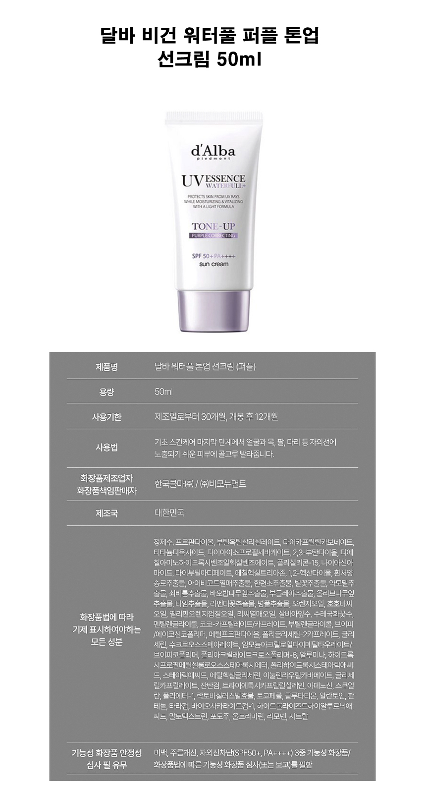 달바 비건 워터풀 퍼플 톤업 선크림 50ml