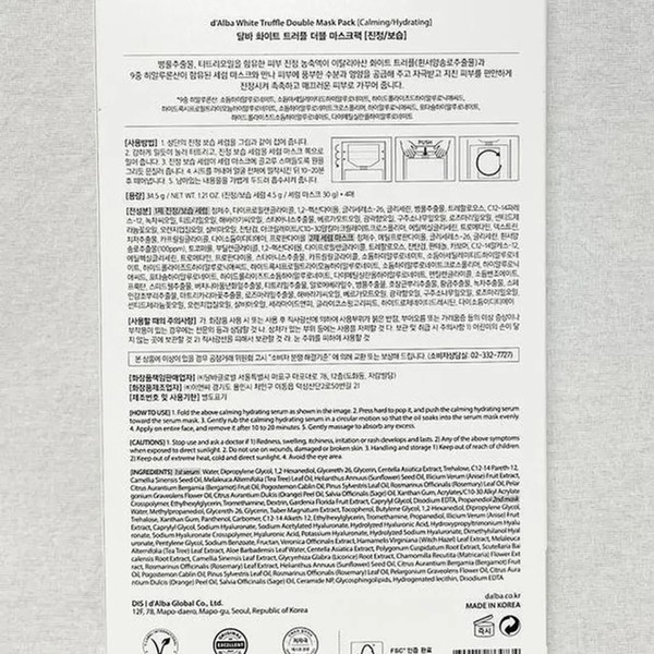 Dalba White Truffle Double Mask Pack (4 packs) (1 box) Soothing moisturizing (SH) / 달바 화이트 트러플 더블 마스크팩 4개입 (1박스) 진정보습(SH)