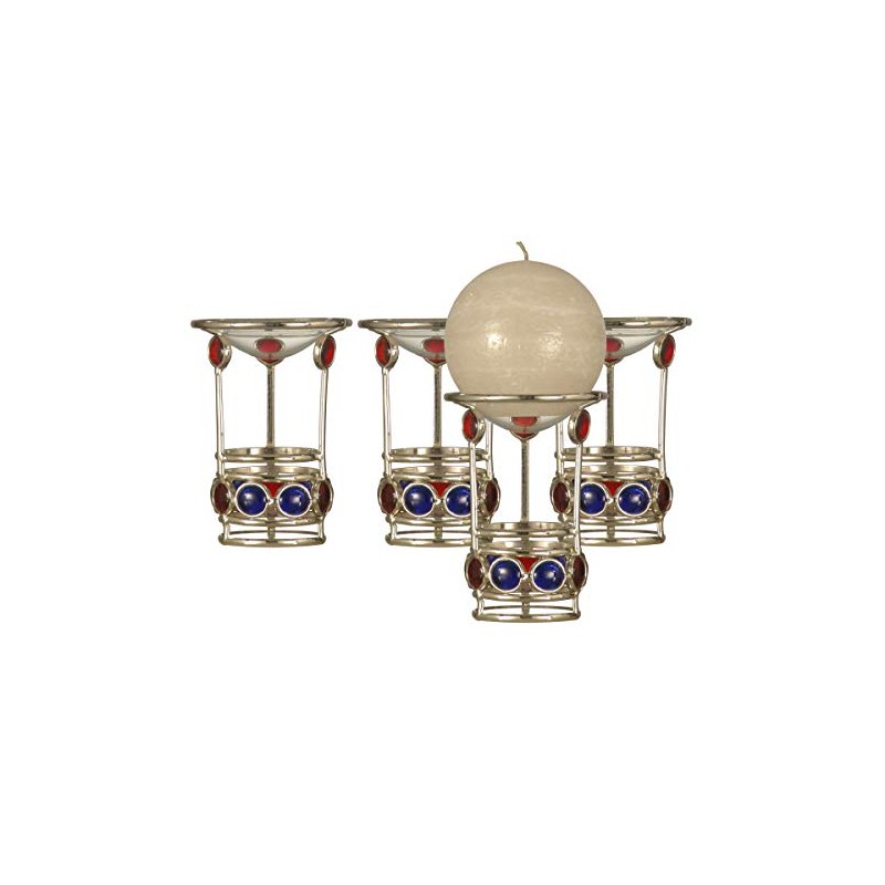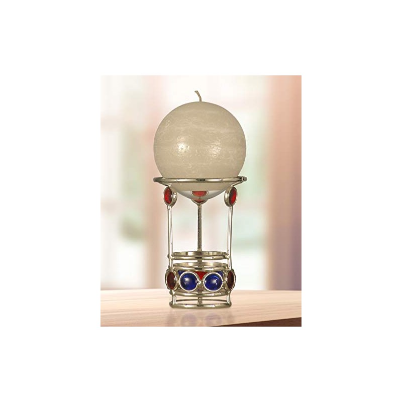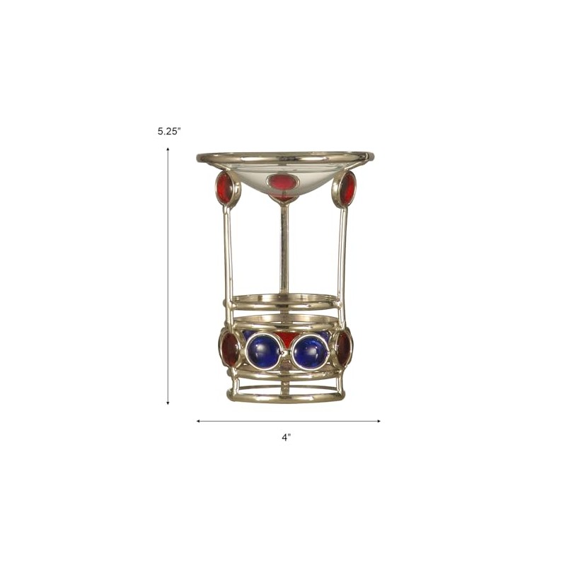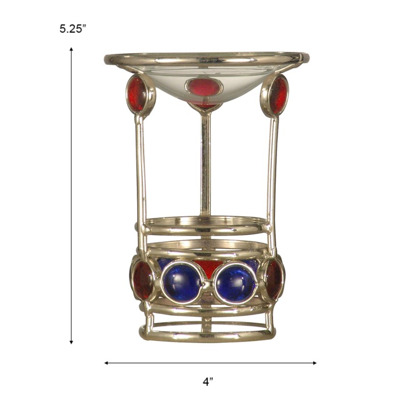 - A row of large blue art glass gems around the base and red glass gems just under the glass martini style candle cup for colorful sparkle and shine